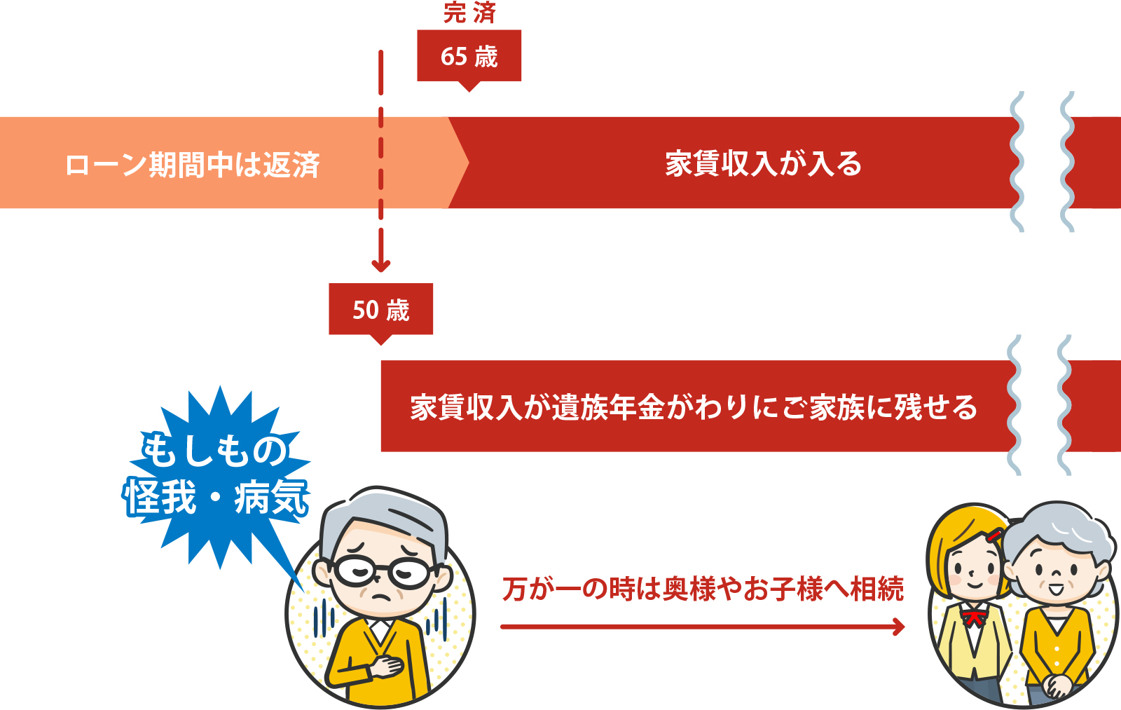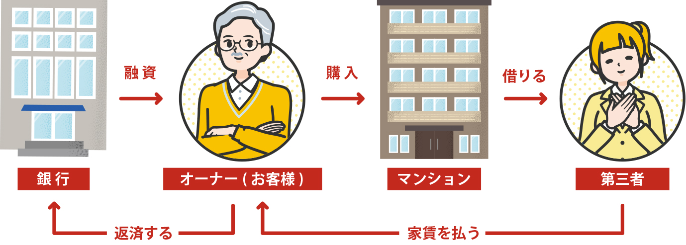 オーナー様の大半が銀行融資を受けて購入します。融資を受ける時には必ず団体信用生命保険に加入していただきます。融資期間中にオーナー様に万が一のことがあった場合に下りる保険となります。